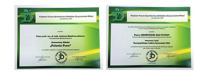 Równocześnie środowisko zawodowe uhonorowało, doceniając nabytą przez wieloletnią pracę i naukę wiedzę oraz szczególne osiągnięcia na rzecz rozwoju polskiej gospodarki odpadami, Pana Henryka Kultysa - Prezesa MPO Kraków tytułem "Europejskiego Lidera Innowacji 2015", za wdrażanie najnowocześniejszych technologii wykorzystywania odpadów jako źródła energii i surowców.
