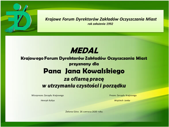 Medal "Za ofiarną pracę w utrzymaniu czystości i porządku" - Krajowe Forum Dyrektorów Zakładów Oczyszczania Miast
