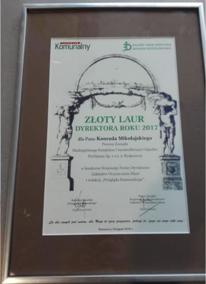 Statuetka Heraklesa z dyplomem Złoty Laur Dyrektora Roku - Krajowe Forum Dyrektorów Zakładów Oczyszczania Miast